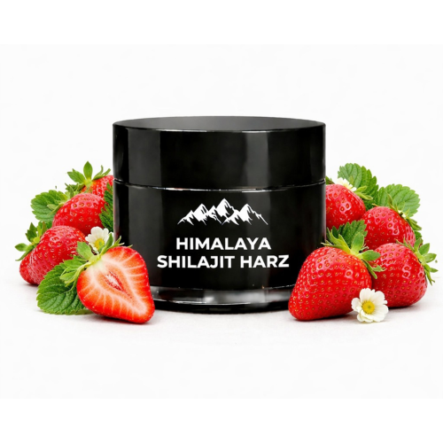 Pure Himalayan Shilajit resin infused with natural strawberry essence, designed to support energy, stamina, and overall wellness with a smooth, fruity taste.